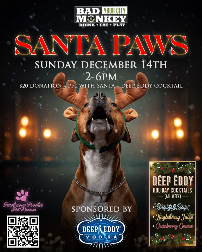 Get ready to deck the paws at our annual Santa Paws event on Sunday, December 22, from 2–6 PM at Bad Monkey Ybor City! Bring your furry friends for festive photos with Santa and delight in the holiday magic—complete with puppy props, snow machines, and a complimentary Surfside or Volando tequila cranberry pomegranate margarita (tbd) to keep spirits bright.
